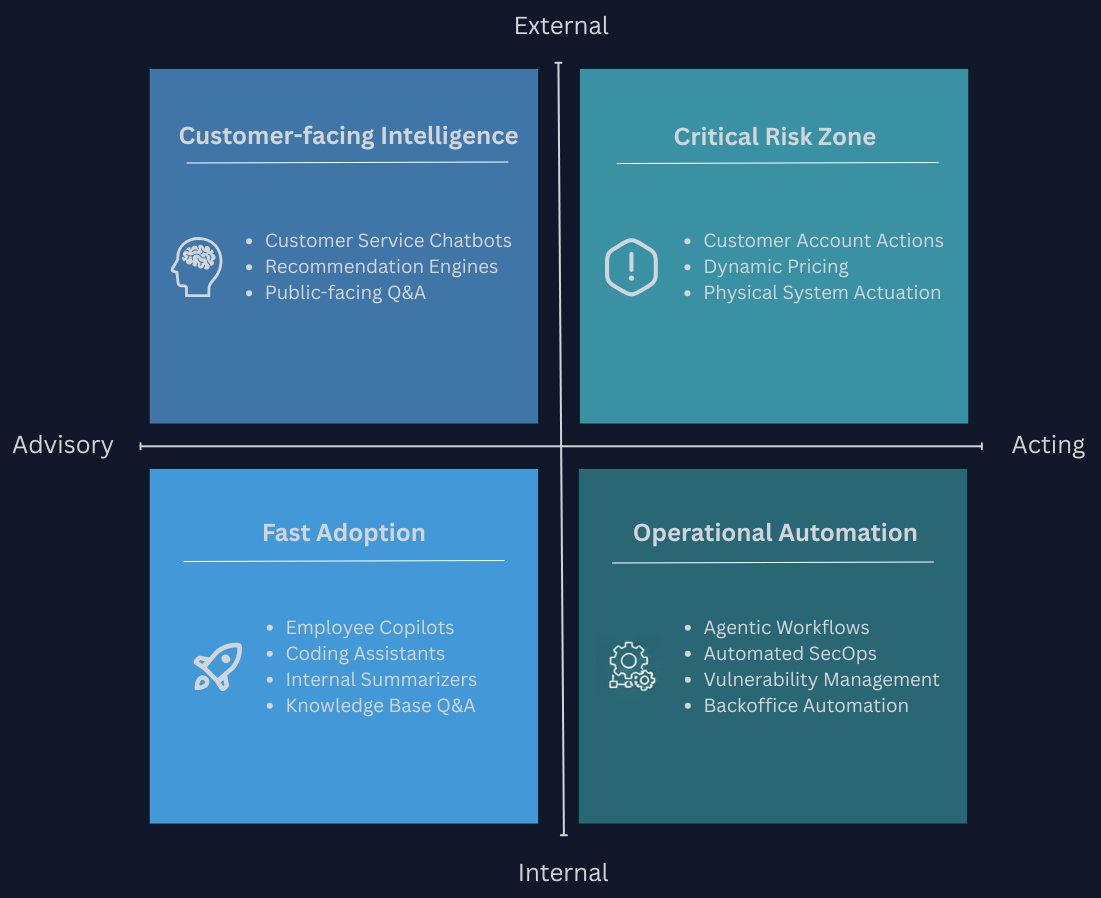 The highest-consequence quadrant. AI acting on behalf of the organization in ways that affect external parties - their accounts, their physical safety, their financial standing - crosses into territory where both the technical and legal stakes are at their highest. The gap between organizational readiness and deployment ambition is most dangerous here.